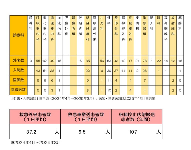 (内科、精神科、脳神経内科、呼吸器内科、消化器内科、循環器内科、血液内科、小児科、外科、乳腺外科、整形外科、脳神経外科、呼吸器外科、心臓血管外科、皮膚科、ひ尿器科、産婦人科、眼科、耳鼻いんこう科、リハビリテーション科、放射線科、麻酔科、消化器外科、腎臓内科、病理診断科)